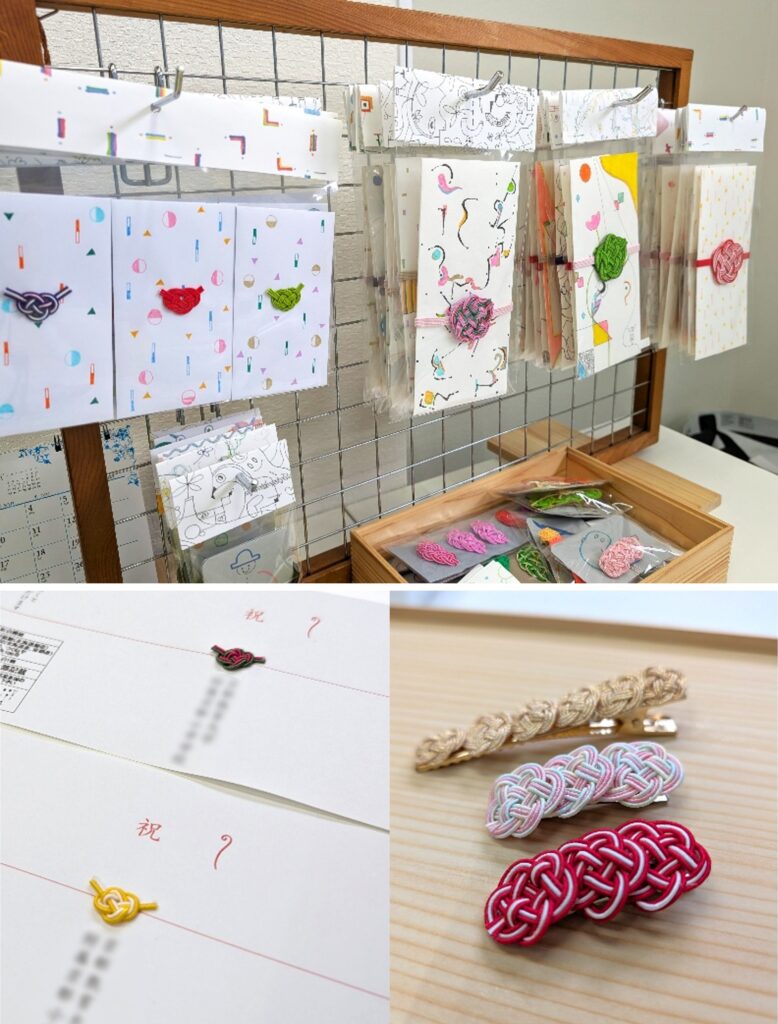 「ダイチ」さんに通う利用者さんは、水引雑貨の製作をはじめ、検品作業や箱組み立て等の軽作業、パソコンでのデータ作業など、さまざまなお仕事に取り組んでいます。なかでも水引雑貨の製作は、管理者の営む和菓子店で、ラッピングの一部として使用したことから魅力が広がっていきました。今では、ご祝儀袋やストラップ、クリップやヘアゴムなどのアクセサリーといった幅広い商品が揃い、今後の商品開発にもさらなる可能性が感じられます。